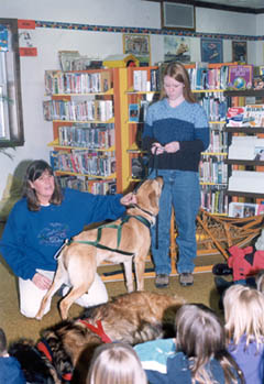 Martha Kalina and Jennifer Skoglund with Perry Greene Colby demonstrating harness and sledding. (Leonberger "Nico" in foreground)